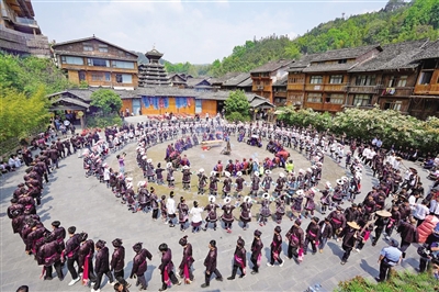 4月19日,贵州省黔东南苗族侗族自治州黎平县肇兴侗寨迎来谷雨节。侗族群众通过举行丰富多彩的民俗活动欢庆节日,吸引游客参与体验。侗族群众身着节日盛装参加踩歌堂活动。