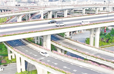 4月23日,西湖大道两侧匝道月季盛开。近日,绵延在浙江杭州多条高架路上的数百万株月季迎来盛花期,造就美丽的“空中花廊”。 据中新社