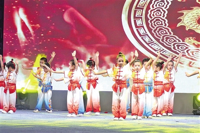 汇演在大气磅礴的《舞龙醒狮》拉开帷幕,萌娃们身着金红狮服,翻腾的彩龙与憨态可掬的小狮子赢得满堂喝彩。整场演出贯穿传统文化与现代活力双重奏:《国服变迁秀》以朝代华服为轴,在T台上绽放千年风华;《愚公移山》通过童趣演绎传递坚韧品格;《中国功夫》刚劲有力的拳脚彰显少年英气:教师团队通过才艺表演《醉清波》,展现教育者的文化底蕴;《摩登时代》以复古服装、元素,带观众“穿越”上世纪;《恐龙乐园》《跳跳糖》,孩子们化身灵动小精灵;当经典童谣《卖报歌》《红星闪闪》经由萌娃纯真童声重新诠释,与教师群舞《爱你》的青春活力相映成趣……