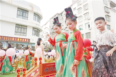 典礼伊始,孩子们悬挂亲手书写的祈愿卡,小小卡片承载着对未来的无限憧憬。随后,在师长的引导下依次迈过象征智慧与希望的“启智门”与“状元桥”,步入人生新阶段。