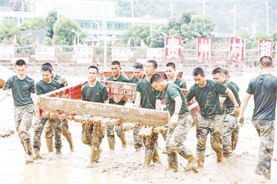 图为6月25日,武警贵州总队黔东南支队官兵在清理贵州“村超”球场的杂物。