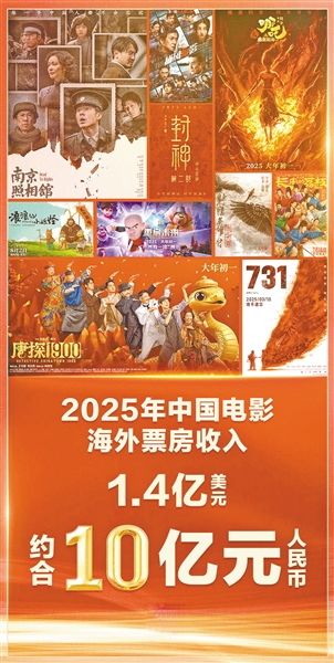 今年以来,在《哪吒之魔童闹海》《南京照相馆》等优秀影片带动下,国内电影市场红红火火,中国电影海外市场也取得可喜成绩。截至10月20日,据不完全统计,2025年中国电影海外票房收入合计1.4亿美元,约合人民币10亿元,超过2024年全年。海外上映国家和地区达到46个,年度海外票房收入超过百万美元的影片达到13部。其中,500万美元以上的7部,1000万美元以上的2部,5000万美元以上的1部。