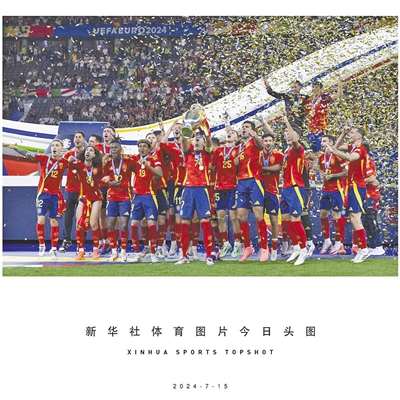 7月14日,在德国柏林进行的2024欧洲足球锦标赛决赛中,西班牙队2比1战胜英格兰队,第四次夺得欧锦赛冠军,由此成为欧锦赛历史上夺冠次数最多的球队。西班牙队在颁奖仪式上庆祝。