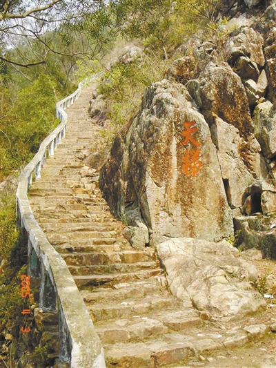 天津漈上有一峰突立,险峻陡峭逼人,这便是海日峰。人行其上,那如烟似浪的烟雾,飘飘悠悠,时升时降,时隐时现,一会儿朝人迎面扑来,一会儿在脚下飞腾缠绕,使人如腾云驾雾一般,仿佛进入了一个神话境界。