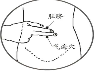 按摩方法:用拇指或食指、中指的指腹着力于气海穴,顺时针或逆时针揉动20—30次,以局部有酸胀感为宜。