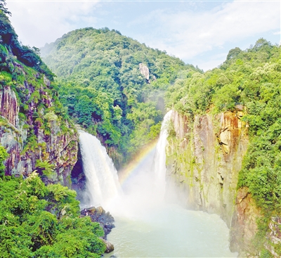 那些藏在水雾里的奇石更令人称奇。蓬莱石卧在湖畔如巨龟探水,瀛洲石上布满天然纹路,倒像仙人踏浪的足迹。黄兴富指着一块被水流磨得光滑的岩石:“这是龙擦石,传说九仙乘龙时蹭亮的。”我们在玄珠石旁休憩,看阳光透过岩缝在水面投下晃动的光斑,忽然明白为何古人要在此题刻“观瀑”二字——面对这般自然奇景,任何文字都显得多余。