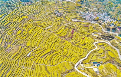 近日,浙江省绍兴市上虞区覆卮山两千余亩古梯田上油菜花盛开,满山金色美不胜收。梯田所在的岭南乡从2009年开始在古梯田打造春季油菜花海、夏季梯田蓄水、秋季金色稻田景观,拉动乡村旅游,今年3月梯田景区已累计接待游客逾30万人次。图为鸟瞰油菜花盛开的覆卮山古梯田。