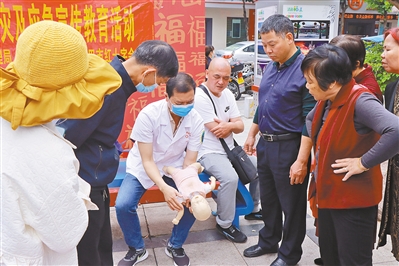 在现场,各相关部门工作人员通过摆设咨询台、宣传展板、分发宣传资料等形式,向市民宣传防灾减灾方针政策和有关法律法规,以及水旱灾害、气象灾害、地震灾害、森林火灾等自然灾害知识和防范应对措施。现场,工作人员 还进行心肺复苏术急救措施实操演练,通过互动交流的形式,提高了市民的安全防范意识和自我保护能力。