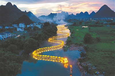 6月18日晚,广西桂林市阳朔县白沙镇遇龙村遇龙河上,一条由55张竹筏组成的550米长的金色“巨龙”巡游,与秀美的山水交相辉映,蔚为壮观。