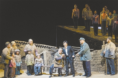 同电视剧一样,歌剧《山海情》以真实人物、故事为原型,在以“史”叙事的基础上加以艺术构思、创作。此前,国家大剧院曾组织主创团队一同前往宁夏调研,实地感受永宁县闽宁镇百姓的生活。“我们到了当地的第一印象是——天高地阔。为什么西北人说话都大嗓门呢?在辽阔的大戈壁,风也大,你自己说话可能自己都听不见,所以人们说话都靠嚷嚷......”导演王筱頔回忆。为了原汁原味地展现地域风貌,王筱頔希望演员尽可能在念白部分以方言呈现,要求演员多去体会身处贫穷的人们的眼神、动作、与人交流的状态。她认为和既有宏大场面,又能精细描摹的电视剧相比,歌剧的独特魅力在于音乐、表演、舞台调度、空间营造等多个要素的融会贯通,并给观众留下了想象空间,“加上观众自己的想象,他们所领悟到的东西可能比我们想要传达的更多。”在戏剧呈现上,王筱頔注重体现人文主义,通过细腻的处理,表现出大时代中小人物的真实情感;舞台视觉上,电子屏与实景交相辉映,舞美呈现融入了宁夏的自然景观与人文元素,追求当代审美意识下的现实主义风格。