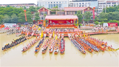 开幕式前,为营造龙舟竞渡氛围,15支参赛代表队还举行了踩街巡游活动。传统的车鼓队、时尚的舞蹈队……身着节日盛装的群众抬着龙舟,载歌载舞走向街头,为市民送上精彩的文艺表演。