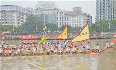 中午两点半,龙舟赛正式开始。随着裁判员一声令下,只见3只龙舟如出水蛟龙瞬时飞出,在水面划出长长的水线。运动员们挥桨击浪,舟上金鼓齐鸣,口哨声、划手雄壮的号子声、船头助威的鼓声,此起彼伏。上万名群众夹岸观赛,加油呐喊声不绝于耳。