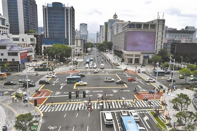 近日,福州东街口出现了新版斑马线,方方正正、纵横套叠的黄白红三色交通标识,让这个市中心的大十字路口看上去像一盘巨大的“飞行棋”。