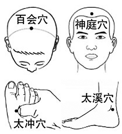 按摩穴位 不习惯艾灸的人,可坚持按揉百会穴、神庭穴(前发际正中直上0.5寸)、太冲穴(位于足背,第1、第2跖骨间,跖骨结合部前方凹陷中)、太溪穴(位于足内侧,内踝后方与脚跟骨筋腱之间的凹陷处)等穴位,以达到滋补肝肾、补血生发的功效。