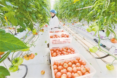 1月5日,在浙江省湖州市德清县阜溪街道龙胜村,工人在温室内采收番茄。近日,各地农民加紧采摘蔬菜供应市场,保障“菜篮子”供应充足。 据新华社