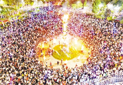 连日来,云南多地欢度火把节,节日活动精彩纷呈,游客如潮。图为7月19日,在云南省大理白族自治州南涧彝族自治县彝族火把节的篝火晚会现场,游客与彝族群众一起欢度火把节。 新华社
