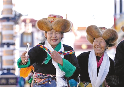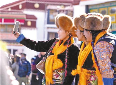 12月1日,西藏拉萨的妇女们盛装来到拉萨大昭寺广场,迎接“仙女节”到来。“仙女节”即吉祥天母节,藏语称“白来日追”。图为拉萨妇女盛装在大昭寺广场拍照。 中新社